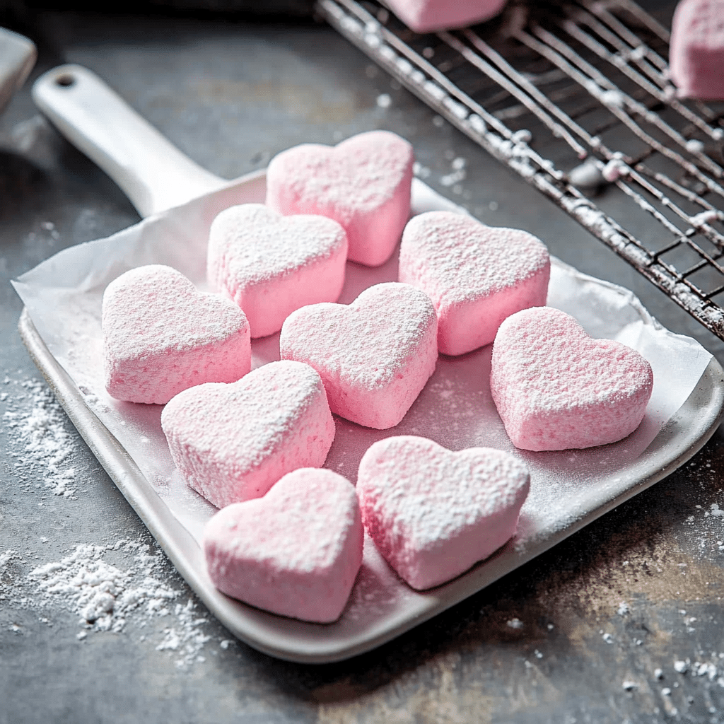 Marshmallows leves e arejados com calda de framboesa fresca, cortados em corações e polvilhados com açúcar de confeiteiro – um deleite perfeito para festas ou presentes.
